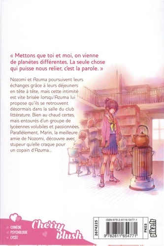 "Mettons que toi et moi, on vienne de planètes différentes. La seule chose qui puisse nous relier, c'est la parole." Nozomi et Azuma poursuivent leurs échanges grâce à leurs déjeuners en tête à tête, mais cette intimité est vite brisée lorsqu'Azuma lui propose qu'ils se retrouvent désormais dans la salle du club littérature. Bien au chaud certes, mais entourés d'un groupe de lycéennes volubiles et passionnées. Parallèlement, Marin, la meilleure amie de Nozomi, découvre avec stupeur qu'elle craque pour un copain d'Azuma...
