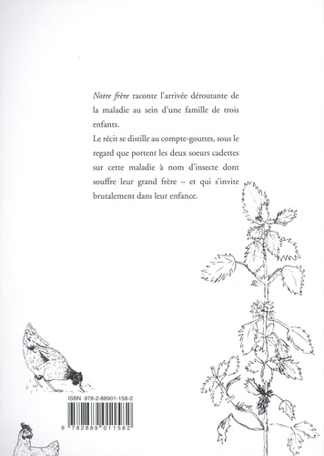 Ce roman graphique raconte l'arrivée déroutante de la maladie au sein d'une famille de trois enfants. Le récit, sensible et pudique, se distille au compte-gouttes sous le regard que portent les deux soeurs cadettes sur cette maladie à nom d'insecte dont souffre leur grand frère, et qui s'invite brutalement dans leur enfance à tous les trois. La spécificité de ce roman graphique tient à son point de vue : l'histoire est racontée à hauteur d'enfants. La maladie psychique n'y est pas analysée, détaillée, disséquée, mais avant tout ressentie, dans ses dimensions primitives faites de peur, d'incompréhension, de tristesse, d'angoisse, mais aussi d'espoir, d'empathie et de fraternité. Or, si ce mince récit nous touche autant, c'est que la maladie psychique - parce qu'elle est encore largement incertaine et taboue en dépit de la connaissance médicale actuelle - nous ramène immanquablement au dénuement pudique de l'enfance : cet enfant que chacun de nous, quel que soit son âge, porte toujours en lui-même. Ce témoignage sensible et pudique d'une maladie seulement évoquée entre les lignes permettra aux plus jeunes d'aborder, de questionner et d'être accompagnés dans la maladie. Il existe en effet beaucoup d'ouvrages sur la schizophrénie mais pratiquement aucun ne s'adresse à des enfants (! ).