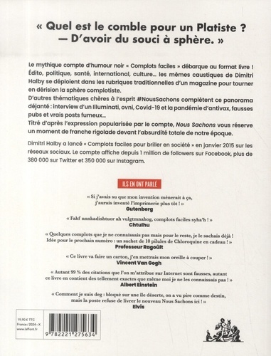 " Quel est le comble pour un Platiste ? - ; D'avoir du souci à sphère. " Le mythique compte d'humour noir " Complots faciles " débarque au format livre ! Edito, politique, santé, international, culture... les mèmes caustiques de Dimitri Halby se déploient dans les rubriques traditionnelles d'un magazine pour tourner en dérision la sphère complotiste. D'autres thématiques chères à l'esprit #NousSachons complètent ce panorama déjanté : interview d'un Illuminati, Ovni, Covid-19 et la pandémie d'antivax, fausses pubs et vrais posts fumeux... Titré d'après l'expression popularisée par le compte, Nous Sachons vous réserve un moment de franche rigolade devant l'absurdité totale de notre époque.