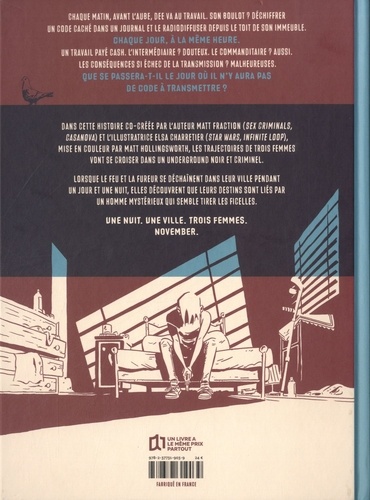 Chaque matin, avant l'aube, Dee va au travail. Son boulot ? Déchiffrer un code caché dans un journal et le radiodiffuser depuis le toit de son immeuble. Chaque jour, à la même heure. Un travail payé cash. L'intermédiaire ? Douteux. Le commanditaire ? Aussi. Les conséquences si échec de la transmission ? Malheureuses. Que se passera-t-il le jour où il n'y aura pas de code à transmettre ? Dans cette histoire co-créée par l'auteur Matt Fraction (Sex Criminals, Casanova- des Best-sellers duNew York Times) et l'illustratrice Elsa Charretier(Star Wars, Infinite Loop), mise en couleur par Matt Hollingsworth, Novembersuit trois femmes dont les trajectoires vont se croiser, dans unundergroundnoir et criminel. Alors que le feu et la fureur se déchaînent dans leur ville pendant un jour et une nuit, elles découvrent que leurs destins sont liés par un homme mystérieux qui semble tirer les ficelles. Une nuit. Une ville. Trois femmes. November.