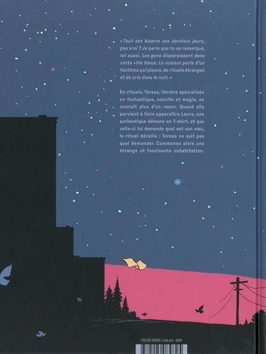 " Tout est bizarre ces derniers jours, pas vrai Ne parie que tu as remarqué, toi aussi. Les gens disparaissent dans cette ville bleue. La rumeur parle d'un fantôme qui pleure, de rituels étranges et de cris dans la nuit." En rituels, Teresa, libraire spécialisée en fantastique, occulte et magie, en connaît plus d'un rayon. Quand elle parvient à faire apparaître Laura, une authentique démone en T-shirt, et que celle-ci lui demande quel est son voeu, le rituel déraille : Teresa ne sait pas quoi demander. Commence alors une étrange et fascinante cohabitation.