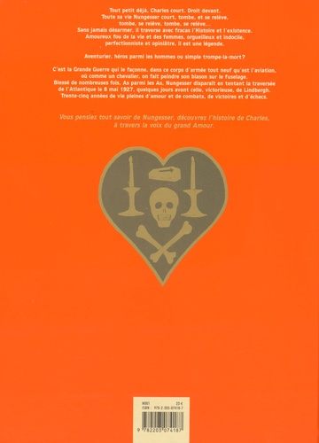 Tout petit déjà, Charles court. Droit devant. Toute sa vie Nungesser court, tombe et se relève, tombe se relève, tombe, se relève... Sans jamais désarmer, il traverse avec fracas l'Histoire et l'existence. Amoureux fou de la vie et des femmes, orgueilleux et indocile, perfectionniste et opiniâtre, il est une légende. Aventurier, héros parmi les hommes ou simple trompe-la-mort ? C'est la Grande Guerre qui le façonne, dans ce corps d'armée tout neuf qu'est l'aviation, où comme un chevalier, on fait peindre son blason sur le fuselage. Blessé de nombreuses fois, As parmi les As, Nungesser disparaît en tentant la traversée de l'Atlantique le 8 mai 1927, quelques jours avant celle, victorieuse, de Lindbergh. Trente-cing années de vie pleines d'amour et de combats, de victoires et d'échecs.