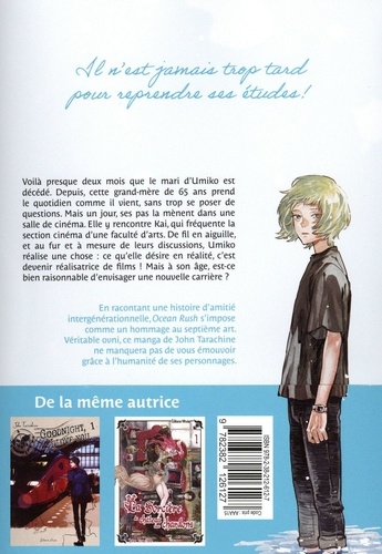 En racontant une histoire d'amitié intergénérationnelle, Ocean Rush s'impose comme un hommage au septième art. Véritable ovni, ce manga de John Tarachine ne manquera pas de vous émouvoir grâce à l'humanité de ses personnages. Voilà presque deux mois que le mari d'Umiko est décédé. Depuis, cette grand-mère de 65 ans prend le quotidien comme il vient, sans trop se poser de questions. Mais un jour, ses pas la mènent dans une salle de cinéma. Elle y rencontre Kai, qui fréquente la section cinéma d'une faculté d'arts. De fil en aiguille, et au fur et à mesure de leurs discussions, Umiko réalise une chose : ce qu'elle désire en réalité, c'est devenir réalisatrice de films ! Mais à son âge, est-ce bien raisonnable d'envisager une nouvelle carrière ?