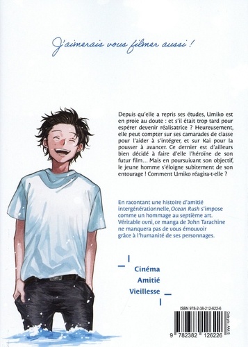 En racontant une histoire d'amitié intergénérationnelle, Ocean Rush s'impose comme un hommage au septième art. Véritable ovni, ce manga de John Tarachine ne manquera pas de vous émouvoir grâce à l'humanité de ses personnages. Depuis qu'elle a repris ses études, Umiko est en proie au doute. Se sentant mise de côté par les étudiants plus jeunes qu'elles, elle commence à se décourager. N'était-ce pas présomptueux, à son âge, de se lancer dans ce projet de devenir réalisatrice de films ? Heureusement qu'elle peut compter sur le soutien de Kai. Tandis que ce dernier se confie sur son passé, la vieille dame a une nouvelle révélation : son film, c'est avec lui qu'elle le fera. Dès lors, la voilà motivée comme jamais !