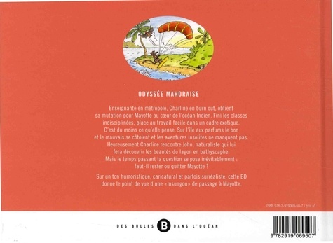 Enseignante en métropole, Charline en burn out, obtient sa mutation pour Mayotte au coeur de l'océan Indien. Fini les classes indisciplinées, place au travail facile dans un cadre exotique. C'est du moins ce qu'elle pense. Sur l'île aux parfums le bon et le mauvais se côtoient et les aventures insolites ne manquent pas. Heureusement Charline rencontre John, naturaliste qui lui fera découvrir les beautés du lagon en bathyscaphe. Mais le temps passant la question se pose inévitablement faut-il rester ou quitter Mayotte ? Sur un ton humoristique, caricatural et parfois surréaliste, cette BD donne le point de vue d'une "msungou" de passage à Mayotte.