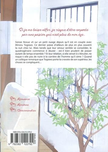 Si je me laisse aller, je risque d'être emporté par une passion qui n'est plus de mon âge... Sanae Nozue vit sur un petit nuage depuis qu'il est en couple avec Minoru Togawa. Ce dernier passe d'ailleurs de plus en plus souvent la nuit chez lui. Mais tandis que leur amour semble se consolider, le quadragénaire commence à douter : est-il bien prudent de passer autant de temps ensemble ? Et leur relation, si elle venait à s'ébruiter, ne risque-t-elle pas de nuire à la carrière de l'homme qu'il aime ? Quand un collègue remarque que Togawa porte la cravate de son supérieur, les choses se compliquent...