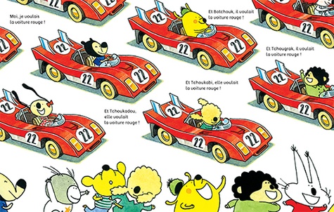 Vite ! C'est le dernier tour de manège pour les Tchouks, ils courent pour monter dans leur véhicule préféré... bien sûr ils veulent tous la voiture rouge, la plus rapide. C'est Tchoukrik qui l'a eue, alors Patatchouk, Tchoukadou, Tchougrak et les autres choisissent leur monture avant le départ, c'est hyper stressant. La course démarre, sus au pompom ! C'est vraiment un chouette manège. BD Jeunesse.