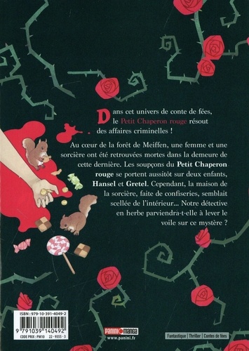 Dans cet univers de conte de fées, le Petit Chaperon rouge résout des affaires criminelles ! Au coeur de la forêt de Meiffen, une femme et une sorcière ont été retrouvées mortes dans la demeure de cette dernière. Les soupçons du Petit Chaperon rouge se portent aussitôt sur deux enfants, Hansel et Gretel. Cependant, la maison de la sorcière, faite de confiseries, semblait scellée de l'intérieur... Notre détective en herbe parviendra-t-elle à lever le voile sur ce mystère ? `