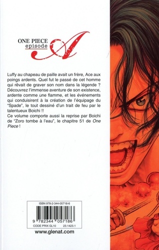 La rencontre au sommet de deux génies ! Luffy au chapeau de paille avait un frère, Ace aux poings ardents. Quel fut le passé de cet homme qui rêvait de graver son nom dans la légende ? Découvrez l'immense aventure de son existence ardente comme une flamme, depuis les événements qui conduisirent à la création de l'équipage du "Spade", le tout dessiné d'un trait de feu par le talentueux Boichi !! Ce volume comporte aussi la reprise par Boichi de Zoro tombe à l'eau, le chapitre 51 de One Piece !