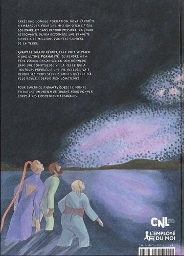 Après une longue formation, Nova s'apprête à embarquer pour une mission scientifique sans retour possible. Confinée dans une fusée dernier cri, la jeune astronaute devra rejoindre la planète L31, située à 2, 5 millions d'années-lumière de la terre. Un voyage qui lui prendra entre 20 et 50 ans. Avant le grand départ, elle doit se plier à une ultime formalité exigée par l'agence spatiale. Elle doit se rendre à la fête d'adieu organisée en son honneur dans une somptueuse villa. Celle qui a toujours privilégié une vie recluse va devoir affronter ses trois seuls amis qu'elle n'a plus revus depuis bien longtemps. Les années ont passé, Ulysse, Yseult et Alan ont bien changé. Avec ASTRA NOVA, Lisa Blumen revient avec un récit de science-fiction unique. Pour l'autrice d'AVANT L'OUBLI, le monde futur est ici encore un moyen détourné pour matérialiser des existences marginales. Cette fois, elles seront confrontées aux affres de l'éloignement et de l'individualisme. L'intrigue se construit au fil des apartés, des souvenirs du passé, de l'évocation des trajectoires bouleversées et solitaires des quatre personnages. Réalisé entièrement aux feutres, ASTRA NOVA est une histoire empreinte d'une nostalgie fugace, comme l'apparition soudaine d'une étoile filante dans la nuit.