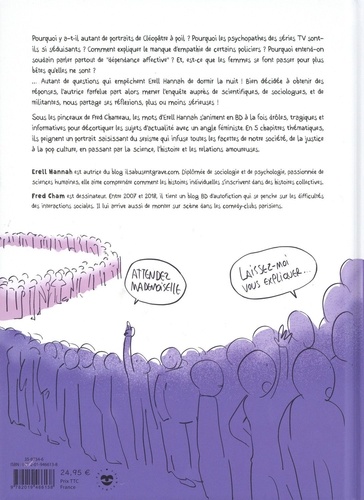 Pourquoi y a-t-il autant de portraits de Cléopâtre à poil ? Pourquoi les psychopathes des séries TV sont-ils si séduisants ? Comment expliquer le manque d'empathie de certains policiers ? Pourquoi entend-on soudain parler partout de "dépendance affective" ? Et, est-ce que les femmes se font passer pour plus bêtes qu'elles ne sont ? ... Autant de questions qui empêchent Erell Hannah de dormir la nuit ! Bien décidée à obtenir des réponses, l'autrice farfelue part alors mener l'enquête auprès de scientifiques, de sociologues, et de militantes, et nous partage ses réflexions, plus ou moins sérieuses ! Sous les pinceaux de Fred Cham, les mots d'Erell Hannah s'animent en BD à la fois drôles, tragiques et informatives pour décortiquer les sujets d'actualité avec un angle féministe. En 5 chapitres thématiques, ils peignent un portrait saisissant du sexisme qui infuse toutes les facettes de notre société, de la justice à la pop culture, en passant par la science, l'histoire et les relations amoureuses. Erell Hannah est autrice du blog ilsabusentgrave. com. Diplômée de sociologie et de psychologie, passionnée de sciences humaines, elle aime comprendre comment les histoires individuelles s'inscrivent dans des histoires collectives. Fred Cham est dessinateur. Entre 2007 et 2018, il tient un blog BD d'autofiction qui se penche sur les difficultés des interactions sociales. Il lui arrive aussi de monter sur scène dans les comedy-clubs parisiens.