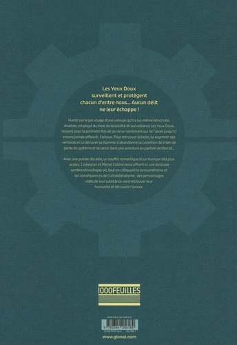 Les Yeux Doux surveillent et protègent chacun d'entre nous... Aucun délit ne leur échappe ! Hanté par le joli visage d'une voleuse qu'il a lui-même dénoncée, Anatole, employé du mois de la société de surveillance Les yeux doux, ressent pour la première fois de sa vie un sentiment qui ne l'avait jusqu'ici encore jamais effleuré : l'amour. Pour retrouver la belle, lui exprimer ses remords et lui déclarer sa flamme, il abandonne sa condition de chien de garde du système et se lance dans une aventure au parfum de liberté... Avec une poésie décalée, un souffle romantique et un humour des plus acides, Corbeyran et Miche lColline nous offrent ici une dystopie sombre et loufoque où, tout en critiquant le consumérisme et les conséquences de l'ultralibéralisme, des personnages vidés de leur substance vont retrouver leur humanité et découvrir l'amour.
