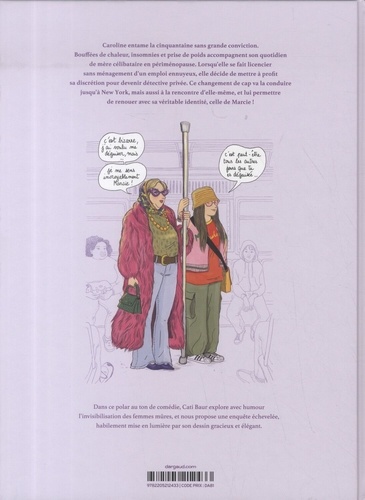 Caroline entame la cinquantaine sans grande conviction. Bouffées de chaleur, insomnies et prise de poids accompagnent son quotidien de mère célibataire en periménopause. Lorsqu'elle se fait licencier sans ménagement d'un emploi ennuyeux, elle décide de mettre profit sa discrétion pour devenir détective privée. Ce changement de cap va la conduire jusqu'à New York, mais aussi à la rencontre d'elle-même, et lui permettre de renouer avec sa véritable identité, celle de Marcie ! Dans ce polar au ton de comédie, Cati Baur explore avec humour l'invisibilisation des femmes mûres, et nous propose une enquête échevelée, habilement mise en lumière par son dessin gracieux et élégant.