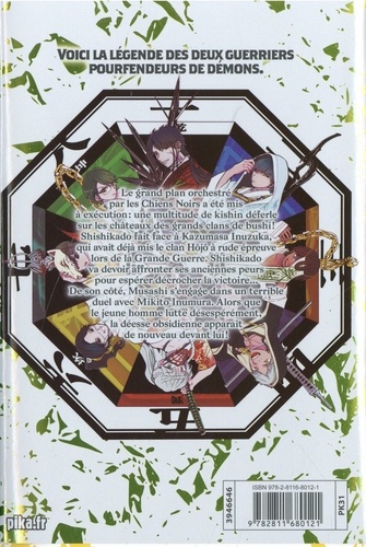 Le grand plan orchestré par les Chiens Noirs a été mis à exécution : une multitude de kishin déferle sur les châteaux des grands clans de bushi ! Shishikado fait face à Kazumasa Inuzuka, qui avait déjà mis le clan Hôjô à rude épreuve lors de la Grande Guerre. Shishikado va devoir affronter ses anciennes peurs pour espérer décrocher la victoire... De son côté, Musashi s'engage dans un terrible duel avec Mikito Inumura. Alors que le jeune homme lutte désespérément, la déesse obsidienne apparaît de nouveau devant lui !