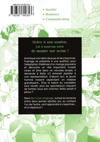 Grâce à son soutien. j'ai a nouveau envie de monter sur scène ! Animé par son désir de jouer et de s'exprimer. Fujinaga se présente à une audition pour l'adaptation théâtrale d'un manga populaire et décroche un rôle important. Investi corps et âme dans ce nouveau projet, il demande à Keito s'il aimerait assister à une représentation. D'abord ravi, le jeune homme ressent cependant un malaise grandissant... Plus le talent du comédien sera révélé, plus les spectateurs risquent de tomber sous son charme ! Keito serait-il jaloux ? Dans Our Love Language, suivez la romance entre deux jeunes adultes qui, au contact l'un de l'autre, vont apprendre à s'exprimer... et à s'épanouir !