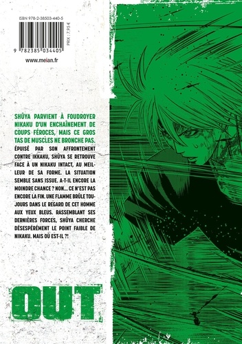 Shûya parvient à foudroyer Nikaku d'un enchaînement de coups féroces, mais ce gros tas de muscles ne bronche pas. Epuisé par son affrontement contre Ikkaku, Shûya se retrouve face a un Nikaku intact, au meilleur de sa forme. La situation semble sans issue. A-t-il encore la moindre chance ? Non... ce n'est pas encore la fin. Une flamme brûle toujours dans le regard de cet homme aux yeux bleus. Rassemblant ses dernières forces, Shûya cherche désespérément le point faible de Nikaku. Mais où est-il ? !