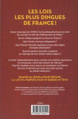 Les lois les plus dingues de France ! Savez-vous que les OVNIS n'ont juridiquement pas le droit de survoler la ville de Châteauneuf-du-Pape ? Qu'un village espagnol se situe en France ? Que l'école n'est pas obligatoire ? Que l'Alsace-Moselle applique encore des règles d'origine allemande ? Que les parents peuvent s'opposer au mariage de leur enfant même majeur ? Le droit, habituellement perçu comme une matière rigoureuse et ennuyeuse, cache des trésors de ridicule ! Paul de Vaublanc nous dresse un inventaire à la Prévert des lois et décrets qui vont vous faire sourire ou même halluciner ! Quand le législateur dérape, la loi n'a parfois plus ni queue ni tête !