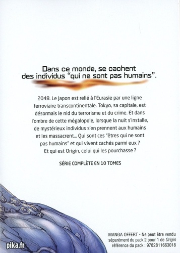 Dans ce monde, se cachent des individus "qui ne sont pas humains". 2048. Le Japon est relié à l'Eurasie par une ligne ferroviaire transcontinentale. Tokyo, sa capitale, est désormais le nid du terrorisme et du crime. Et dans l'ombre de cette mégalopole, lorsque la nuit s'installe, de mystérieux individus s'en prennent aux humains et les massacrent... Qui sont ces "êtres qui ne sont pas humains" et qui vivent cachés parmi eux ? Et qui est Origin, celui qui les pourchasse ?