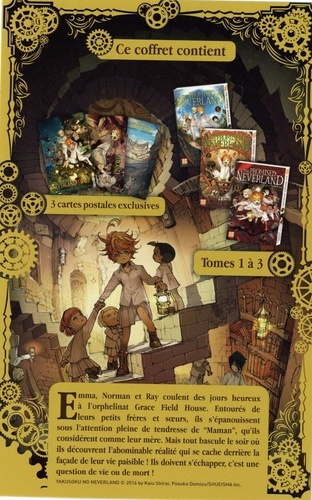 Emma, Norman et Ray coulent des jours heureux à l'orphelinat Grace Field House. Entourés de leurs petits frères et soeurs, ils s'épanouissent sous l'attention pleine de tendresse de"Maman", qu'ils considèrent comme leur mère. Mais tout bascule le soir où ils découvrent l'abominable réalité qui se cache derrière la façade de leur vie paisible ! Ils doivent s'échapper, c'est une question de vie ou de mort !