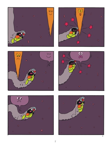 Il est petit Il est poilu C'est Petit Poilu ! Le v'là parti de bon matin Le v'là parti et tout va bien. Mais ?... Que se passe-t-il ? Ça se bouscule Et tout bascule ! Une galerie souterraine Un potager luxuriant De nouveaux amis. Accueillants et protecteurs Et la guêpe qui rôde Avec son dard pointu... Vas-y. Petit Poilu. Fonce !