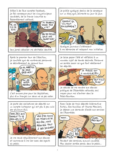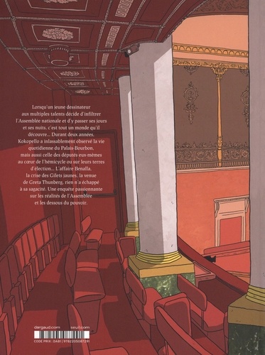 Lorsqu'un jeune dessinateur aux multiples talents décide d'infiltrer l'Assemblée nationale et d'y passer ses jours et ses nuits, c'est tout un monde qu'il découvre... Durant deux années, Kokopello a inlassablement observé la vie quotidienne du Palais-Bourbon, mais aussi celle des députés eux-mêmes au coeur de l'hémicycle ou sur leurs terres d'élection... L'affaire Benalla, la crise des Gilets jaunes, la venue de Greta Thunberg, rien n'a échappé à sa sagacité. Une enquête passionnante sur les réalités de l'Assemblée et les dessous du pouvoir.