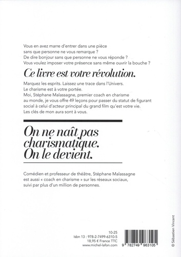 Vous en avez marre d'entrer dans une pièce sans que personne ne vous remarque ? De dire bonjour sans que personne ne vous réponde ? Vous voulez imposer votre présence sans même ouvrir la bouche ? Ce livre est votre révolution. Marquez les esprits. Laissez une trace dans l'Univers. Le charisme est à votre portée. Moi, Stéphane Malassagne, premier coach en charisme au monde, je vous offre 49 leçons pour passer du statut de figurant social à celui d'acteur principal du grand film qu'est votre vie. Les clés de mon aura sont à vous. On ne naît pas charismatique. On le devient.