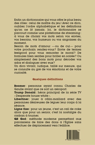Enfin un dictionnaire qui vous offre le plus beau des rôles : celui de maître du jeu ! Avec ce dico, oubliez l'ordre alphabétique et les définitions qu'on ne lit jamais. Ici, le dictionnaire se parcourt comme une plateforme de streaming : à vous de choisir vos mots selon vos envies, vos besoins, vos humeurs ou vos angoisses du moment. Besoin de mots d'amour — ou de cul — pour votre prochain rendez-vous ? Envie de termes feelgood pour vous remonter le moral ? De formules bien senties pour briller en soirée ? Ou simplement des bons mots pour décoder vos ados et dialoguer avec eux ? Un dico vivant, ludique, taillé sur mesure, qui se consulte au gré de vos émotions et de votre curiosité. Quelques définitions Boomer : personne ayant connu Charles de Gaulle avant que ce soit un aéroport. Trump Donald : héros principal de la série TV " Desperate house white ". Libertiner : jouer à câlin-maillard avec des personnes désireuses de léguer leur corps à la séance. Ligne fixe : pour un jeune, c'est un rail de coke alors que pour un senior, c'est la nostalgie du cadran à tourner. QR God : méthode moderne permettant aux paroissiens de faire des dons à l'Eglise sans effectuer de déplacement vers l'édifice.
