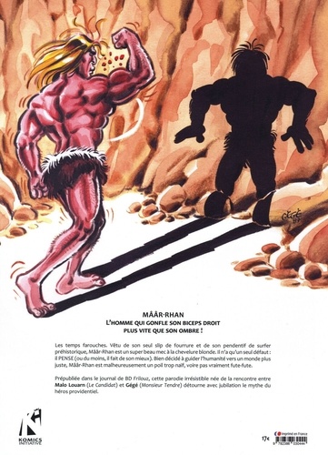Les temps farouches. Vêtu de son seul slip de fourrure et de son pendentif de surfer préhistorique, Maar-Rhan est un super beau mec à la chevelure blonde. Il n'a qu'un seul défaut : il PENSE (ou du moins, il fait de son mieux). Bien décidé à guider l'humanité vers un monde plus juste, Maar-Rhan est malheureusement un poil trop naïf, voire pas vraiment fute-fute. Prépubliée dans le journal de BD Frilouz, cette parodie irrésistible née de la rencontre entre Malo Louarn (Le Candidat) et Gégé (Monsieur Tendre) détourne avec jubilation le mythe du héros providentiel.
