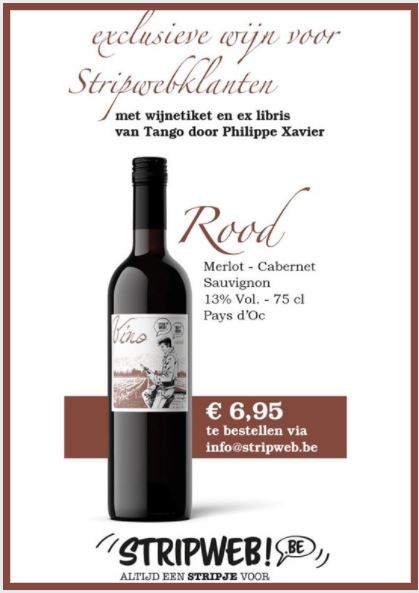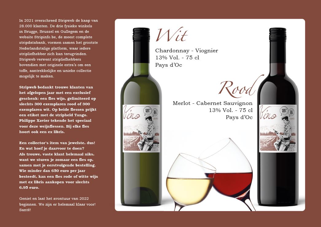 In 2021 overschreed Stripweb de kaap van 28.000 klanten. De drie fysieke winkels in Brugge, Brussel en Gullegem en de website Stripinfo.be, de meest complete stripdatabank, vormen samen het grootste Nederlandstalige platform, waar iedere stripliefhebber zich kan terugvinden. Stripweb verwent stripliefhebbers bovendien met originele extra’s om een toffe, aantrekkelijke en unieke collectie mogelijk te maken. Stripweb bedankt trouwe klanten van het afgelopen jaar 2021 met een exclusief geschenk: een fles wijn, gelimiteerd op slechts 300 exemplaren rood of 300 exemplaren wit. Op beide flessen prijkt een etiket met de stripheld Tango. Philippe Xavier tekende het speciaal voor deze wijnflessen. Bij elke fles hoort ook een ex libris. leverbaar vanaf 12/12/2021 Een collector’s item van jewelste, dus! En wat hoef je daarvoor te doen? Als trouwe, vaste klant helemaal niks, want we sturen je zomaar een fles op, samen met je eerstvolgende bestelling. Wie minder dan 650 euro per jaar besteedt, kan een fles rode of witte wijn met ex libris aankopen voor slechts 6,95 euro. Geniet en laat het avontuur van 2022 beginnen. We zijn er helemaal klaar voor! Santé! Chardonnay - Viognier 13% Vol. - 75 cl Pays d’Oc Merlot - Cabernet Sauvignon 13% Vol. - 75 cl Pays d’Oc