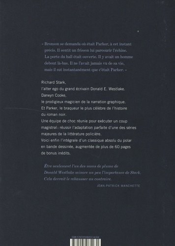 "Bronson se demanda où était Parker, à cet instant précis. Il sentit un frisson lui parcourir l'échine. La porte du hall était ouverte. Il y avait un homme debout là-bas. Il ne l'avait jamais vu de sa vie, mais il sut instantanément que c'était Parker." Richard Stark, d'alter ego du grand écrivain Donald E. Westlake. Darwyn Cooke, le prodigieux magicien de la narration graphique. Et Parker, le braqueur le plus célèbre de l'histoire du roman noir. Une équipe de choc réunie pour exécuter un coup magistral : réussir l'adaptation parfaite d'une des séries majeures de la littérature policière. Voici enfin l'intégrale d'un classique absolu du polar en bande dessinée, augmentée de plus de 60 pages de bonus inédits Etre seulement l'un des noms de plume de Donald Westlake minore un peu l'importance de Stark. Cela devrait le rehausser au contraire. Jean-Patrick Manchette