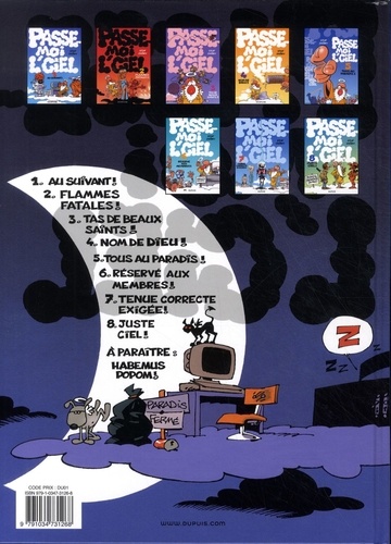 Tout le monde meurt un jour ou l'autre et se retrouve " de l'autre côté ". Et cela fait plus de vingt-cinq ans que Stuf et Janry nous racontent ce qui se passe après la mort. Et l'accueil au paradis (ou en enfer) n'est pas triste : on y retrouve pêle-mêle les chaussettes célibataires, les dinosaures (grosse affluence il y a 65 millions d'années) ou encore Atchoum, Prof et Timide (ça, c'était la fois où Blanche-Neige avait décidé de faire une tarte aux pommes...). Quant aux chanteurs de charme et autres princes charmants, ils risquent fort de finir en enfer, Saint Pierre supportant mal la concurrence de ces bellâtres... Bref, en attendant que votre dernière heure soit venue, Passe-moi l'ciel est une saine lecture rigolote vivement recommandée ! Dans un souci de repérages tout à son honneur, Stuf a décidé de partir explorer le paradis. C'était en 2015. Depuis, Janry continue la série seul...
