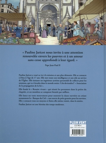 "Pauline Jaricot nous invite à une attention renouvelée envers les pauvres et à un amour sans cesse approfondi à leur égard". Pape Jean-Paul II Pauline Jaricot a voué sa vie à la mission et aux plus démunis. Elle se consacre à Dieu à l'âge de 17 ans. Elle met toute son intelligence et son zèle au service de l'Eglise. Elle instaure un ingénieux système pyramidal de collecte pour les missions, qui va s'étendre dans le monde entier. Cela deviendra l' "Association de la propagation de la foi" . Elle fonde le "Rosaire vivant" qui réunit les personnes dans la prière du chapelet, et ses membres se comptent bientôt par milliers. Elle lance un vaste mouvement pour soutenir la classe ouvrière en créant notamment la "Banque du Ciel" , une oeuvre de prêts gratuits pour les ouvriers. Elle y consacre tous ses moyens et finira elle-même ruinée, dans la misère. Pauline Jaricot est une héroïne des temps modernes.
