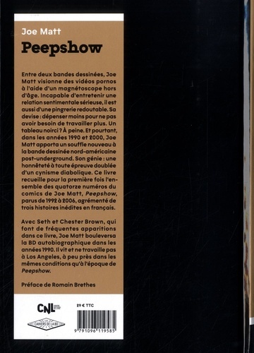 Entre deux bandes dessinées, Joe Matt visionne des vidéos pornos à l'aide d'un magnétoscope hors d'âge. Incapable d'entretenir une relation sentimentale sérieuse, il est aussi d'une pingrerie redoutable. Sa devise : dépenser moins pour ne pas avoir besoin de travailler plus. Un tableau noirci ? A peine. Et pourtant, dans les années 1990 et 2000, Joe Matt apporta un souffle nouveau à la bande dessinée nord-américaine post-underground. Son génie : une honnêteté à toute épreuve doublée d'un cynisme diabolique. Ce livre recueille pour la première fois l'ensemble des quatorze numéros du comics de Joe Matt, Peepshow, parus de 1992 à 2006, agrémenté de trois histoires inédites en français.