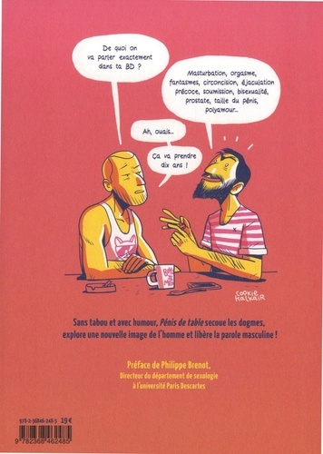 " Le sexe est un mystère. On en parle peu. En tout cas pas en détail. Et surtout pas nous, les hommes ". Partant de ce constat, Cookie Kalkair organise des tables rondes avec 6 compères. Pénis de table, c'est donc une discussion libre, sans jugement ni tabous entre 7 hommes aux sexualités diverses. Masturbation, orgasme, performance, sentiments, fantasmes, ces hommes vont se dire ce qu'ils n'avaient dit à personne, apprendre des autres et en apprendre sur eux-mêmes. Souvent drôle, parfois cru, toujours documenté et jamais salace, Pénis de table secoue les dogmes et explore une nouvelle image de l'homme. A l'heure où la sexualité féminine est beaucoup questionnée, Cookie Kalkair libère la parole masculine... qui en avait bien besoin !