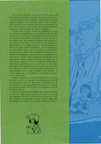 Le port de Rapallo connaît au XVIe siècle les incursions des barbaresques. Il est donc tout naturel que l'univers des marins et des pirates fascine Luciano Bottaro. Son crayon donne vie à Aroldo le Boucanier, au capitaine Bomba, au mousse Tim et à bien d'autres marins funambulesques sillonnant une improbable mer des Caraïbes. Pepito naît en 1952. Il est vite adopté par l'éditeur français Sagédition, qui publie à partir de 1954 une revue éponyme. Combattant pour la justice, le corsaire commande le navire La Cacahuète et son équipage de matelots excentriques, amateurs de rhum et de tafia, de ducats et de doublons : le lieutenant Crochette, le Bosco Ventempoupe, La Merluche, Bec-de-Fer, Stockfish... Leurs aventures se déroulent dans des Caraïbes imaginaires, quelque part entre l'île de Pâques et Hispaniola, et plus précisément à Las Ananas, possession du roi Alonzo XXXIV, que dirige sa Ventripotence le gouverneur Hernandez de La Banane. Arborant le Jolly Roger, Pepito se montre fidèle à l'idéal libertaire des gentilshommes de fortune et ridiculise les ineptes représentants de l'autorité, qu'ils soient roi, officiers, nobles, fonctionnaires, médecins ou scientifiques, tous aussi stupides que cupides, à commencer par l'incapable et corrompu gouverneur La Banane. Bottaro donne ici une interprétation souvent ironique, toujours joyeuse et burlesque, proche de la commedia dell'arte, des récits de Stevenson ou de Salgari, et des grands films qu'ils ont inspirés dans les années 1940 et 1950, de Capitaine Blood à L'île au trésor. Alors, moussaillons, hissez les voiles et mettez le cap sur l'île aux Surprises. Vous la trouverez sans peine. Par 24° 12' de latitude Nord et 74° 48' de longitude Ouest, elle se situe dans la Mer des Sargasses, au milieu du triangle des Bermudes.