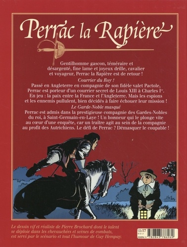 Gentilhomme gascon, téméraire et désargenté, fine lame et joyeux drille, cavalier et voyageur, Perrac la Rapière est de retour ! Courrier du Roy ! Passé en Angleterre en compagnie de son fidèle valet Pactole, Perrac est porteur d'un courrier secret de Louis XIII à Charles Ier. En jeu : la paix entre la France et l'Angleterre. Mais les espions et les ennemis pullulent, bien décidés à faire échouer leur mission ! Le Garde-Noble masqué. Perrac est admis dans la prestigieuse compagnie des Gardes-Nobles du roi, à Saint-Germain-en-Laye ! Un honneur qui le plonge vite au coeur d'une enquête, car un traître agit au sein de la compagnie au profit des Autrichiens. Le défi de Perrac ? Démasquer le coupable !