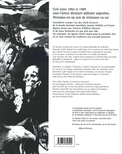 Il a fallu huit ans à Alberto Breccia et Juan Sasturain pour réaliser Perramus. Dans cette grande fresque de plus de 460 pages, les auteurs ont transposé toute l'histoire (avec un grand H), les symboles et les mythes de l'Amérique Latine : la dictature militaire et ses disparitions (Breccia rend hommage à son scénariste Hector OEsterheld, disparu durant cette période), le tango avec Carlos Gardel, la passion du football, l'influence des Etats-Unis avec Henry Kissinger et Frank Sinatra et, bien sûr, la littérature, avec des versions fantasmées de Jorge Luis Borges et Gabriel Garcia Marquez. En 1982, la dictature militaire est au pouvoir en Argentine. C'est dans ce contexte particulièrement difficile que Perramus voit le jour. Sur les deux premiers livres sur les quatre qui composent cette oeuvre, le récit prend pour toile de fond cauchemardesque un état totalitaire fantasmagorique. Perramus est un homme qui a laissé mourir ses compagnons de révolte pour fuir et qui, incapable de faire face à cette réalité, s'abandonne à l'oubli. Devenu l'homme sans mémoire, il va parcourir le monde en quête d'identité et de rédemption avec pour compagnons de fortune Canelones, l'Ennemi et Jorge Luis Borges. Par sa genèse, son contexte politique, le talent de ses créateurs, le style toujours novateur d'Alberto Breccia, Perramus est un roman graphique incontournable.