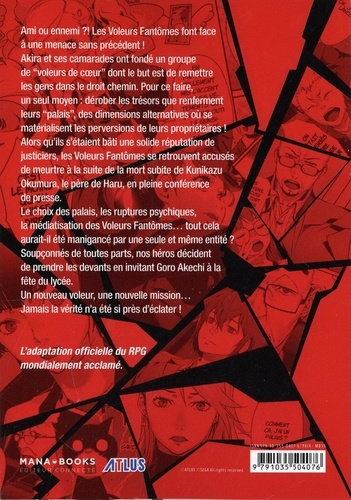 L'adaptation officielle du RPG mondialement acclamé ! Ami ou ennemi ? ! Les Voleurs Fantômes font face à une menace sans précédent ! Akira et ses camarades ont fondé un groupe de "voleurs de coeur' dont le but est de remettre les gens dans le droit chemin. Pour ce faire, un seul moyen : dérober les trésors que renferment leurs "palais', des dimensions alternatives où se matérialisent les perversions de leurs propriétaires ! Alors qu'ils s'étaient bâti une solide réputation de justiciers, les Voleurs Fantômes se retrouvent accusés de meurtre à la suite de la mort subite de Kunikazu Okumura, le père de Haru, en pleine conférence de presse. Le choix des palais, les ruptures psychiques, la médiatisation des Voleurs Fantômes... tout cela aurait-il été manigancé par une seule et même entité ? Soupçonnés de toutes parts, nos héros décident de prendre les devants en invitant Goro Akechi à la fête du lycée. Un nouveau voleur, une nouvelle mission... Jamais la vérité n'a été si près d'éclater !