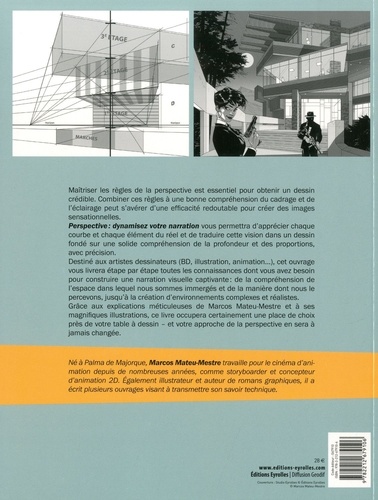 Maîtriser les règles de la perspective est essentiel pour obtenir un dessin crédible. Combiner ces règles à une bonne compréhension du cadrage et de l'éclairage peut s'avérer d'une ef ? cacité redoutable pour créer des images sensationnelles. Perspective : dynamisez votre narration vous permettra d'apprécier chaque courbe et chaque élément du réel et de traduire cette vision dans un dessin fondé sur une solide compréhension de la profondeur et des proportions, avec précision. Destiné aux artistes dessinateurs (BD, illustration, animation...), cet ouvrage vous livrera étape par étape toutes les connaissances dont vous avez besoin pour construire une narration visuelle captivante : de la compréhension de l'espace dans lequel nous sommes immergés et de la manière dont nous le percevons, jusqu'à la création d'environnements complexes et réalistes. Grâce aux explications méticuleuses de Marcos Mateu-Mestre et à ses magni ? ques illustrations, ce livre occupera certainement une place de choix près de votre table à dessin - et votre approche de la perspective en sera à jamais changée.