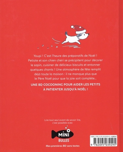 Aidez les petits à patienter jusqu'à Noël avec Petiote et son chien dans cette bande dessinée chaleureuse et festive ! Suivez Petiote et son chien dans leurs préparatifs de Noël dans cette adorable bande dessinée ! L'histoire : Youpi ! C'est l'heure des préparatifs de Noël ! Petiote et son chien chéri se précipitent pour décorer le sapin, cuisiner de délicieux gâteaux et entonner quelques chants ! Une atmosphère de fête remplit déjà toute la maison : il ne manque plus que le Père Noël pour que la joie soit complète... Une BD sans texte conçue pour les petits dès 3 ans : les images racontent toute l'histoire sans sauter d'étapes. Lire tout seul avant de savoir lire, c'est possible avec la collection Mini Bulles ! Sans texte, chacun est libre de se raconter l'histoire comme il le souhaite : à partir des images, l'enfant passe à l'oral et fait des phrases pour vous raconter l'histoire ou lire tout seul.