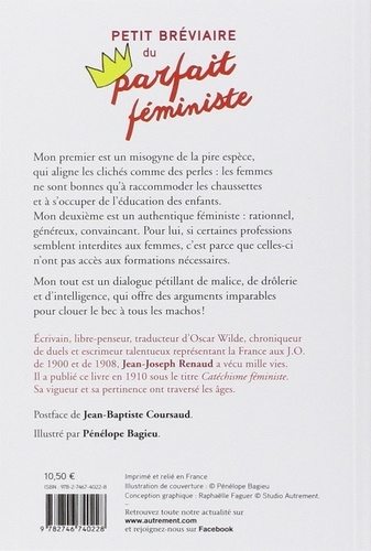 Mon premier est un misogyne de la pire espèce, qui aligne les clichés comme des perles : les femmes ne sont bonnes qu'à raccommoder les chaussettes et à s'occuper de l'éducation des enfants. Mon deuxième est un authentique féministe : rationnel, généreux, convaincant. Pour lui, si certaines professions semblent interdites aux femmes, c'est parce que celles-ci n'ont pas accès aux formations nécessaires. Mon tout est un dialogue pétillant de malice, de drôlerie et d'intelligence, qui offre des arguments imparables pour clouer le bec à tous les machos !