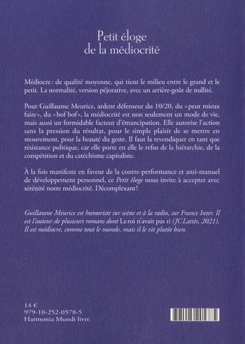 Médiocre : de qualité moyenne, qui tient le milieu entre le grand et le petit. La normalité, version péjorative, avec un arrière-goût de nullité. Pour Guillaume Meurice, ardent défenseur du 10/20, du " peut mieux faire ", du " bof bof ", la médiocrité est non seulement un mode de vie, mais aussi un formidable facteur d'émancipation. Elle autorise l'action sans la pression du résultat, pour le simple plaisir de se mettre en mouvement, pour la beauté du geste. Il faut la revendiquer en tant que résistance politique, car elle porte en elle le refus de la hiérarchie, de la compétition et du catéchisme capitaliste. A la fois manifeste en faveur de la contre-performance et anti-manuel de développement personnel, ce Petit éloge nous invite à accepter avec sérénité notre médiocrité. Décomplexant !