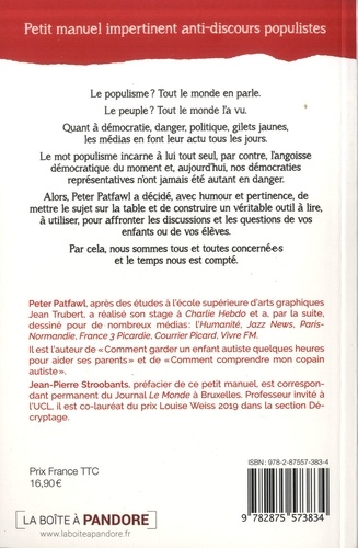 Le populisme ? Tout le monde en parle. Le peuple ? Tout le monde l'a vu. Quant à démocratie, danger, politique, gilets jaunes, les médias en font leur actu tous les jours. Le mot populisme incarne à lui tout seul, par contre, l'angoisse démocratique du moment et, aujourd'hui, nos démocraties représentatives n'ont jamais été autant en danger. Alors, Peter Patfawl a décidé, avec humour et pertinence, de mettre le sujet sur la table et de construire un véritable outil à lire, à utiliser, pour affronter les discussions et les questions de vos enfants ou de vos élèves. Par cela, nous sommes tous et toutes concernées et le temps nous est compté.