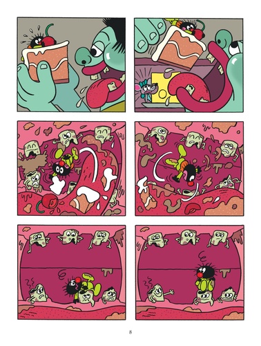 Rapetissé lors de son passage dans un étrange chemin, Petit Poilu atterrit dans un garde-manger bien rempli. Installé sur une part de gâteau, il y rencontre Soussou, une gentille souris. Mais voici que Profitroll, l'enfant troll, saisit la part de gâteau et l'enfourne dans sa grande bouche de glouton ! Assis sur la langue de Profitroll, au coeur d'une bande de dents plus cariées et cassées les unes que les autres, Petit Poilu va tout faire pour sauver les pauvres petites dents de lait ! Un album sous le signe de l'aide et l'entraide !