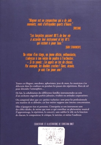Toutes ces blagues, anecdotes, aphorismes, jeux de mots, les musiciens s'en délectent dans les coulisses ou pendant les pauses des répétitions. Rien de tel pour détendre l'atmosphère... De fait, la cohabitation des différentes familles instrumentales au sein d'un orchestre engendre parfois jalousies, rivalités ou attitudes corporatistes. On comprend alors que ces "petites vacheries" sont pour les professionnels une manière de se défouler, car leur métier suppose une intense concentration. Elles n'épargnent rien ni personne. L'interprète et son instrument sont des cibles idéales, de même que tout ce qui contribue au phénomène musical (l'apprentissage, la répétition, le concert), sans oublier le rôle ou la fonction de chacun, le compositeur, le critique, le mécène, et même l'auditeur.