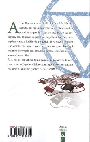 Aki et Kenma sont en difficulté face à la Marionnettiste, qui révèle son vrai visage ! Tandis qu'Iori prend le risque de voler au secours de ses collègues, son douloureux passé se rappelle à lui. Car, pour espérer vaincre l'alliée de Senjudoji, il va devoir prendre une cruelle décision... mais c'est sans compter Riku, qui maîtrise désormais son pouvoir d'aimant et refuse de voir son ami se sacrifier ! A la fin de cet ultime tome palpitant, découvrez la rencontre entre Yayoi et Chihiro, ainsi que la version initiale du premier chapitre publiée dans le JUMP !