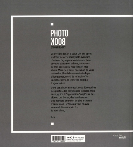 Tout Kev Adams en son et lumières Ce livre me tenait à coeur. Dix ans après le début de cette incroyable aventure, c'est une façon pour moi de vous faire voyager dans mon univers, au travers de mes spectacles, mes films et mes séries. Mais c'est aussi l'occasion de vous remercier. Merci de me soutenir depuis si longtemps, merci de m'avoir offert la chance de faire le métier dont j'ai toujours rêvé. Dans cet album interactif, vous découvrirez des photos, des confidences inédites, mais aussi, grâce à l'application SnapPress, des vidéos, des bonus, des bandes-sons... Une manière pour moi de dire à chacun d'entre vous : " Voilà où vous m'avez emmené dix ans après ! " Je vous aime, Kev