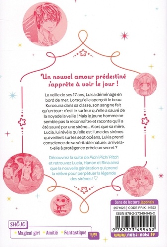 La veille de ses 17 ans, Lukia déménage en bord de mer. Lorsqu'elle aperçoit le beau Kurosuna dans sa classe, son sang ne fait qu'un tour : c'est le surfeur qu'elle a sauvé de la noyade la veille ! Mais le jeune homme ne semble pas la reconnaître et raconte qu'il a été sauvé par une sirène... Alors que sa mère, Lucia, lui révèle qu'elle est l'une des sirènes qui veillent sur les sept océans, Lukia prend conscience de sa véritable nature : arrivera- t-elle à protéger ce précieux secret ? Découvrez la suite de Pichi Pichi Pitch et retrouvez Lucia, Hanon et Rina ainsi que la nouvelle génération qui prend la relève pour perpétuer la légende des sirènes !