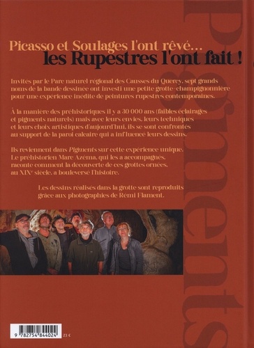 Picasso et Soulages l'ont rêvé, 7 grands noms de la bande dessinée l'ont fait ! Edmond Baudoin, Chloé Cruchaudet, Etienne Davodeau, Emmanuel Guibert, David Prudhomme, Pascal Rabaté et Troubs ont été invités par le Parc du Quercy à investir une petite grotte champignonnière pour une expérience inédite de peintures rupestres contemporaines. A la manière des préhistoriques il y a 30000 ans (faibles éclairages et pigments naturels) mais avec leurs envies, leurs techniques et leurs choix artistiques d'aujourd'hui, les dessinateurs se sont confrontés au support de la paroi calcaire qui a influencé leurs dessins. Les auteurs reviennent dans Pigments sur cette expérience unique et le préhistorien Marc Azéma, qui les a accompagnés, raconte l'histoire des grottes rupestres et leur découverte. Les dessins réalisés dans la grotte seront reproduits grâce aux photographies de Rémi Flament.