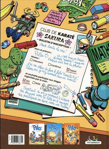 L'imagination de ce gamin ne prend jamais de repos ! Pilo se met au Karaté. Sa maman est ravie parce qu'il paraît que ça défoule et que ça a un effet relaxant. Pilo va enfin pouvoir canaliser son énergie. Mais avant de mettre un pied sur le tatami, il faut aller chez le médecin pour un check-up et un certificat médical, puis prendre la direction du forum des associations pour inscrire Pilo au club et enfin acheter un kimono au magasin de sport. Autant de mini aventures pour ce petit garçon à l'imagination sans limite qui va découvrir qu'un peu de sagesse, ça a du bon.